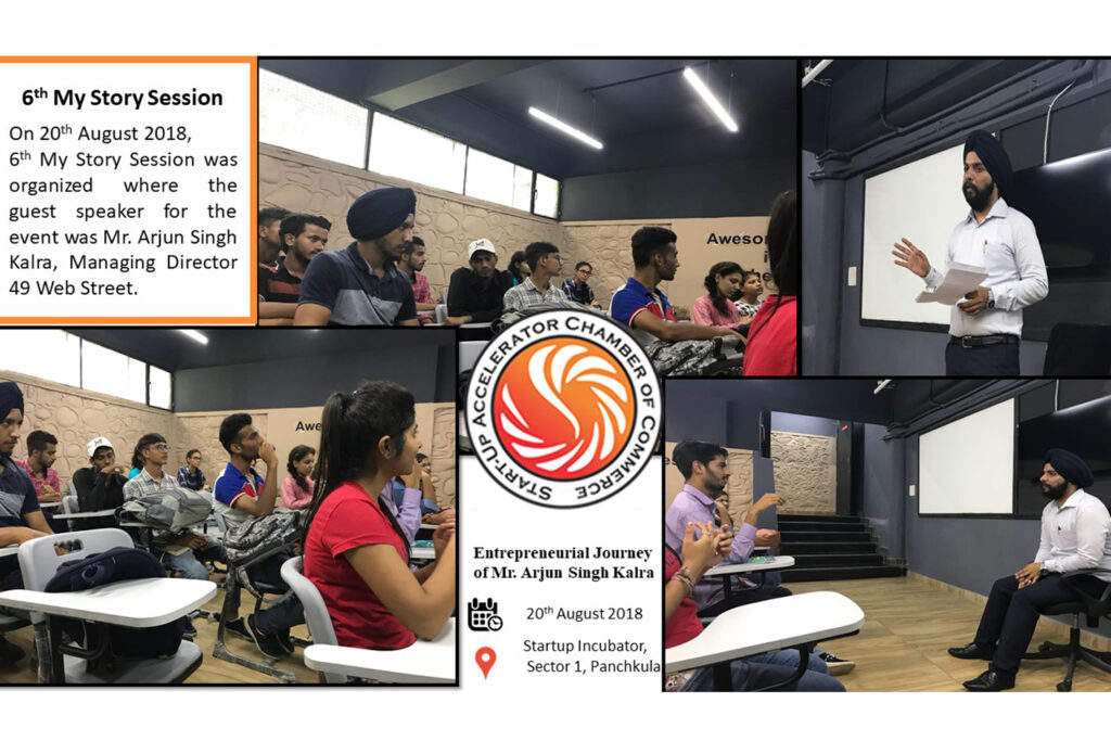 On 20th August 2018, Team Startup Incubator cum Centre of Excellence hosted its 6th My Story Session with Mr. Arjun Singh Kalra, Managing Director 49 Web Street. Mr. Arjun is a dynamic multi-faceted professional with over 12 years of rich experience in Shipping Industry, IT Services, Software Products, B2B & B2C Platforms, Online Marketing, Operations, Crisis Management, Personnel Administration, Trainings and social activities. In his interaction with students, he shared his entrepreneurial journey and made the students aware about the importance of generating sales at an early stage of the startup.