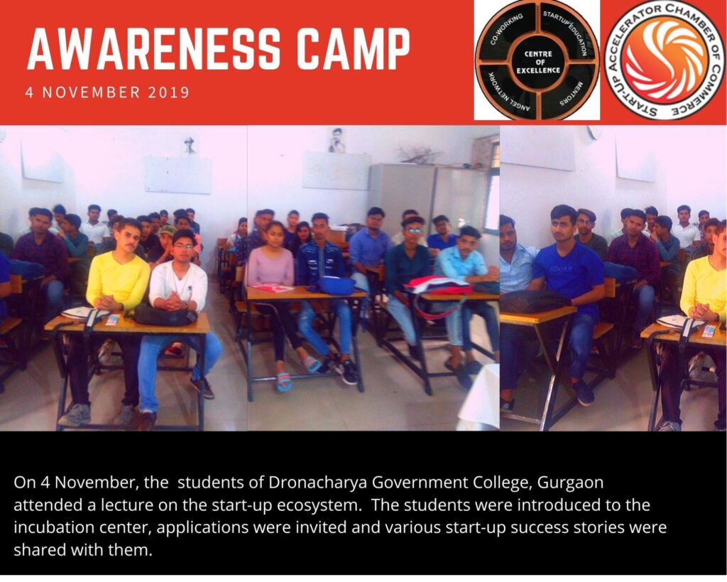 On 4th November 2019, students of Dronacharya Government College attended a lecture on the start-up ecosystem. The students were introduced to the start-up ecosystem, applications were invited and various startup success stories were shared with them.