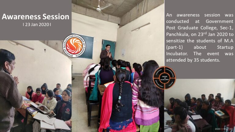 An awareness session was conducted at Government Post Graduate College, Sec-1, Panchkula, on 23rd Jan 2020 to sensitize the students of M.A (part-1) about Startup Incubator. The event was attended by 35 students.