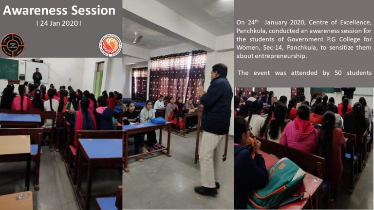 On 24th January 2020, Centre of Excellence, Panchkula, conducted an awareness session for the students of Government P.G College for Women, Sec-14, Panchkula, to sensitize them about entrepreneurship.