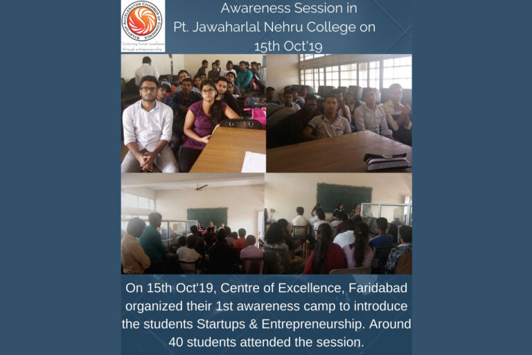 On 15th Oct’19, students of Pt. Jawaharlal Nehru College attended their 1st awareness session about Start-ups & Entrepreneurship. The Students were briefed about what start-up is & how the young / college youth is making a trend towards the start-up culture & proving out to be young successful entrepreneurs.