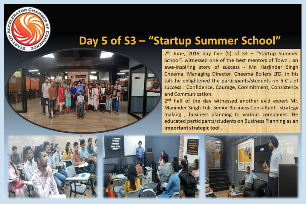 7th June, 2019 day five (5) of S3 – “Startup Summer School”, witnessed one of the best mentors of Town , an awe-inspiring story of success – Mr. Harjinder Singh Cheema, Managing Director, Cheema Boilers LTD, in his talk he enlightened the participants/students on 5 C’s of success : Confidence, Courage, Commitment, Consistency and Communication.