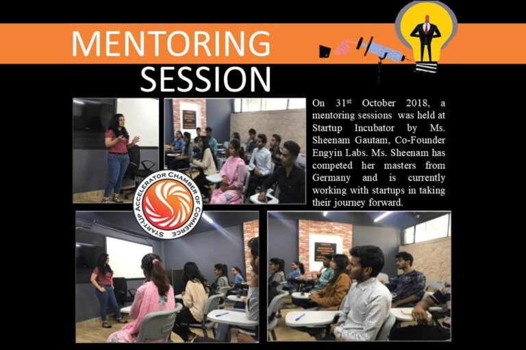 On 31st October 2018, a mentoring session was held at Startup Incubator by Ms. Sheenam Gautam, Co-Founder EngyinLabs. Ms. Sheenam has competed her master’s degree from Germany and is currently working with startups in taking their entrepreneurial journey forward. She interacted with students at the incubator and guided them through the process of Entrepreneurship.