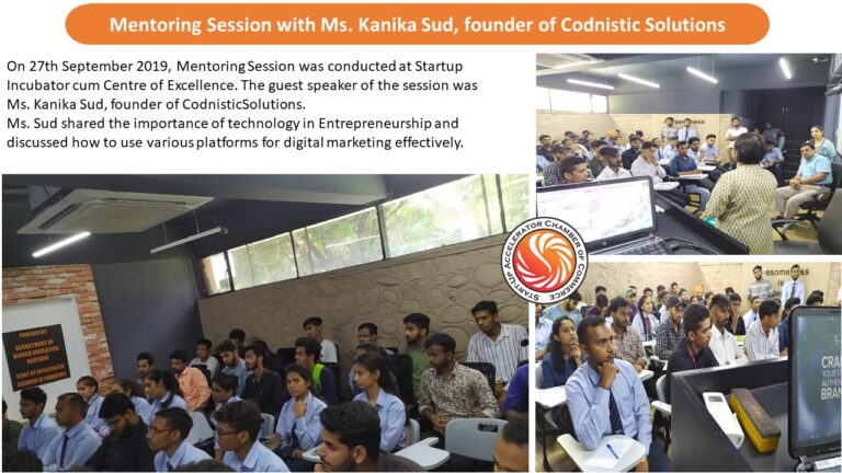 On 27th September 2019, Mentoring Session was conducted at Startup Incubator cum Centre of Excellence. The guest speaker of the session was Ms. Kanika Sud, founder of Codnistic Solutions. Ms. Sud shared the importance of technology in Entrepreneurship and discussed how to use various platforms for digital marketing effectively.