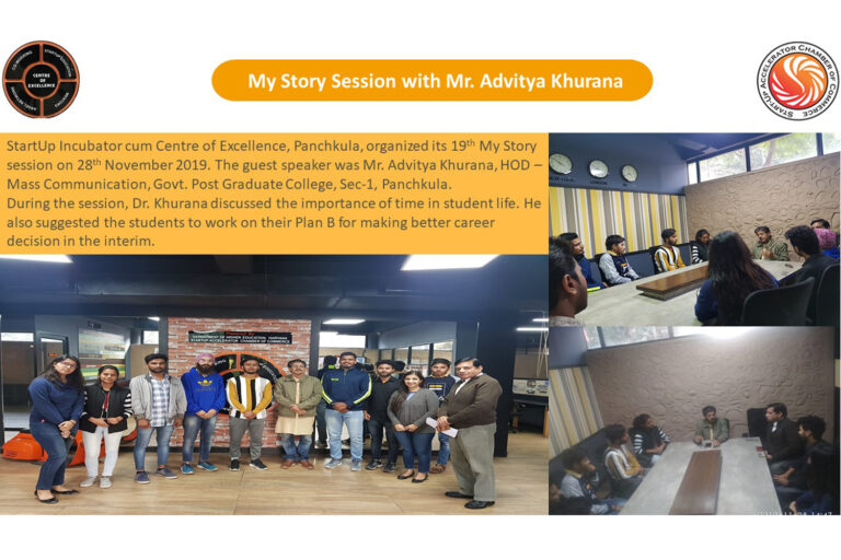 Centre of Excellence, Panchkula, organized its 19th My Story session on 28th November 2019. The guest speaker was Mr. Advitya Khurana, HOD – Mass Communication, Govt. Post Graduate College, Sec-1, Panchkula.