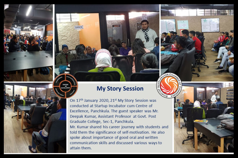 On 17th January 2020, 21st My Story Session was conducted at Startup Incubator cum Centre of Excellence, Panchkula. The guest speaker was Mr. Deepak Kumar, Assistant Professor at Govt. Post Graduate College, Sec-1, Panchkula. Mr. Kumar shared his career journey with students and told them the significance of self-motivation. He also spoke about importance of good oral and written communication skills and discussed various ways to attain them.