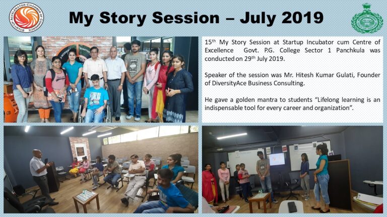 15th My Story Session at Startup Incubator cum Centre of Excellence Govt. P.G. College Sector 1 Panchkula was conducted on 29th July 2019. Speaker of the session was Mr. Hitesh Kumar Gulati, Founder of DiversityAce Business Consulting. He gave a golden mantra to students “Lifelong learning is an indispensable tool for every career and organization”.