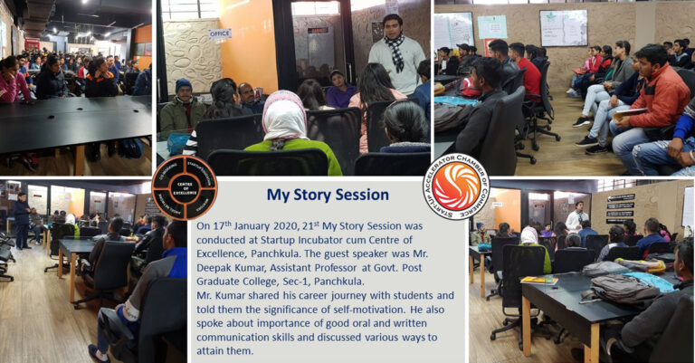 On 17th January 2020, 21st My Story Session was conducted at Startup Incubator cum Centre of Excellence, Panchkula. The guest speaker was Mr. Deepak Kumar, Assistant Professor at Govt. Post Graduate College, Sec-1, Panchkula.