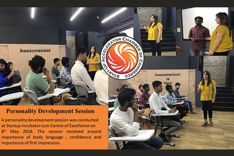 Looking at the needs of the concerned strata, SACC arranged a Personality Development Session at Startup Incubator cum Centre of Excellence on 8th May 2018. The session sensitized students about the importance of creating a positive first impression, body language, and confidence building. Looking at the way session was received by students these sessions will be organized more frequently.The main motive of SACC here was helping students at the incubator in developing their soft skills so that they can become confident and well-equipped entrepreneurs.