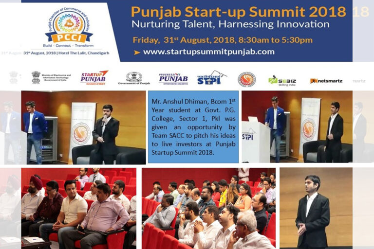On 31st August 2018, Punjab Chamber of Commerce and Industries (PCCI), Government of Punjab, STPI, Ministry of Science and Technology with SACC as knowledge partners organized Punjab Startup Summit, one of the biggest Startup Summit of Punjab. In the summit there was a pre pitching session which took place at STPI building in Mohali on 24th August 2018. After scrutinizing and preparing budding entrepreneurs from Startup Incubator cum Centre of Excellence, Mr. Anshul Dhiman, B.Com 1st year student at Government P.G. College, Sector 1, Panchkula was selected to pitch for funds in the above said pre pitching event of 24th August 2018. This pre pitch session gave him an immense exposure on how to pitch for funds and also gave him networking opportunity wherein he connected with Angel Investors, Mentors and Industry Leaders.