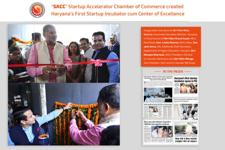 Department of Higher Education in association with Startup Accelerator Chamber of Commerce (SACC) launched its first Startup Incubator cum Center of Excellence of Haryana, at Govt PG College, Sector 1, Panchkula on 10th April, 2018. Education Minister Ram Bilas Sharma in the presence of Gian Chand Gupta, MLA, Panchkula, Latika Sharma, MLA, Kalka, Jyoti Arora (IAS), Additional Chief Secretary, Department of Higher Education, Manipal Dhariwal, SACC President, CEO and Co-founder Netsmartz and Shri Nitin Monga, Vice President, SACC inaugurated the Centre.
