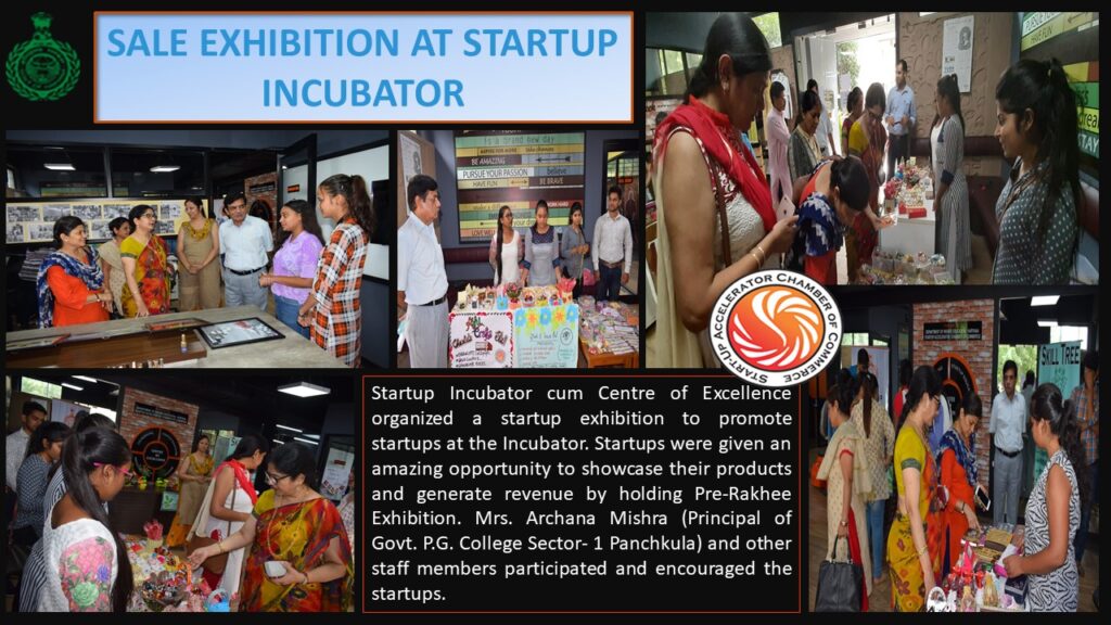 Startup Incubator cum Centre of Excellence organized a startup exhibition to promote startups at the Incubator. Startups were given an amazing opportunity to showcase their products and generate revenue by holding Pre-Rakhee Exhibition. Mrs. Archana Mishra (Principal of Govt. P.G. College Sector- 1 Panchkula) and other staff members participated and encouraged the startups.