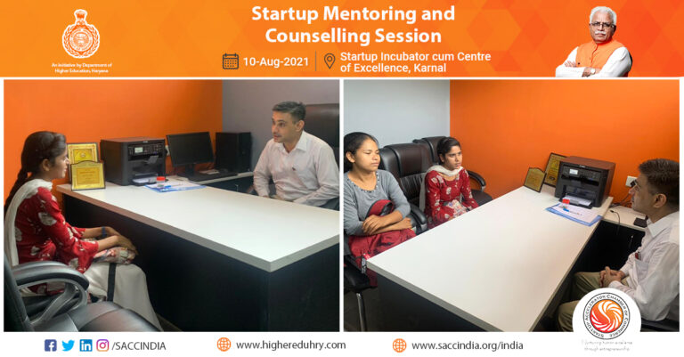 On August 10, 2021, SACC India organized a Startup Mentoring and Counselling session in collaboration with the Department of Higher Education, Haryana, at Startup Incubator cum Center of Excellence, Karnal.
