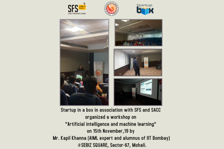 Startup in a box in association with Sebiz Finishing School and Startup accelerator chamber of Commerce organized a Workshop on “Artificial intelligence and machine learning” on 15th November,19 by Mr.Kapil Khanna (AIML expert and Alumnus IIT bombay) @SEBIZ SQUARE, Sector-67, Mohali.