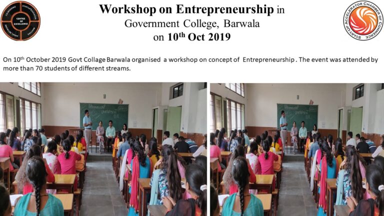 On 10th October 2019 Govt Collage Barwala organised a workshop on concept of Entrepreneurship . The event was attended by more than 70 students of different streams.